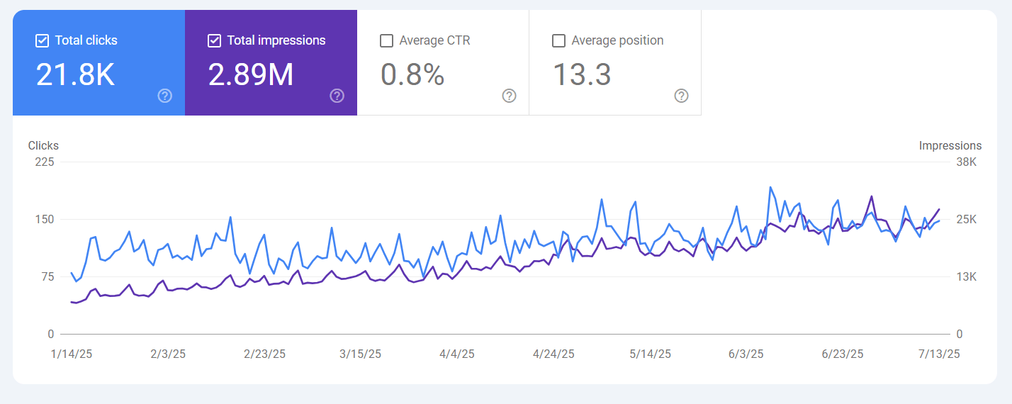 Google Search Console analytics: 21.8K organic website visitors in six months
